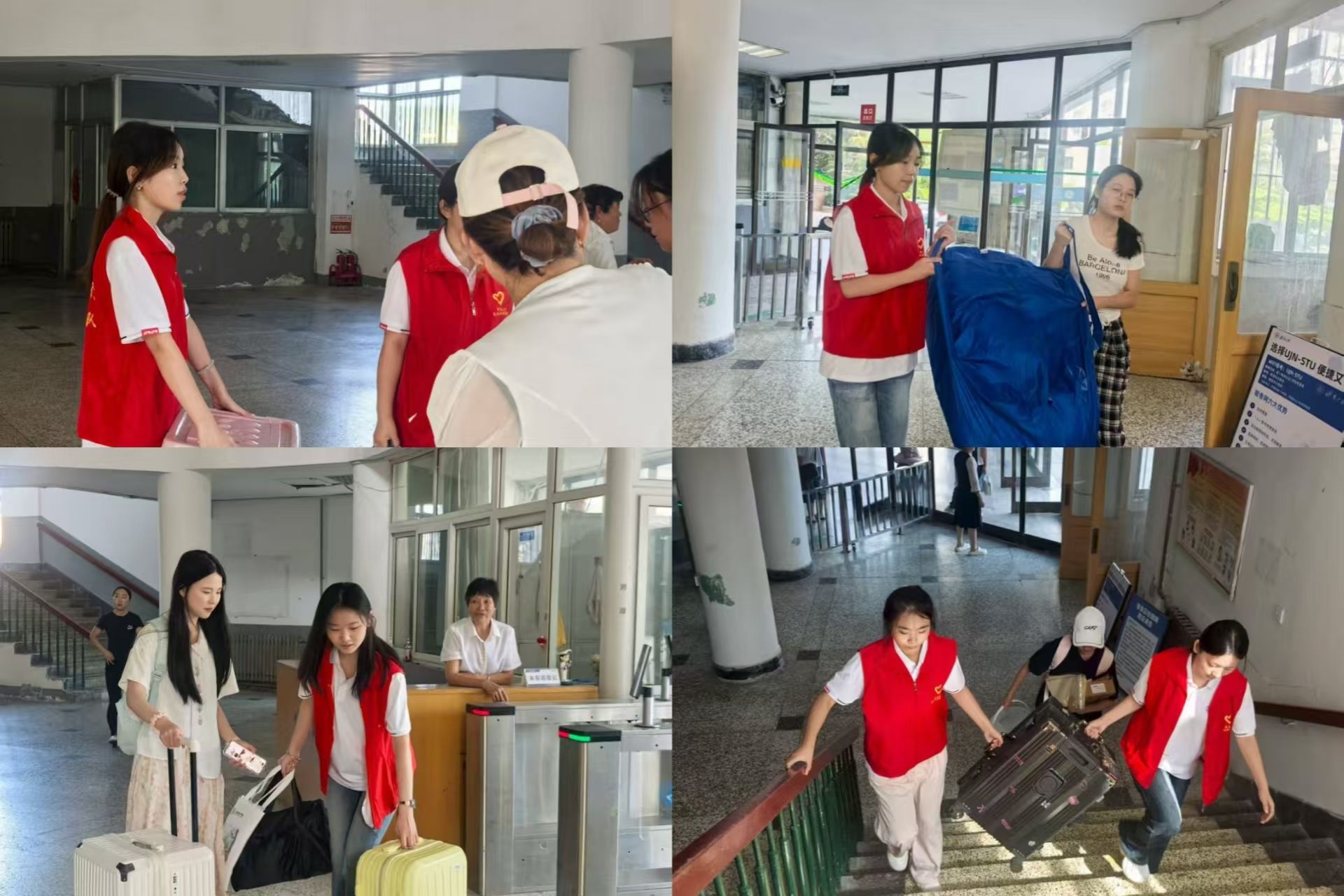 在校门口,志愿者们身着统一红色志愿服装,早早等候在校园入口处。看到拖着行李箱、满怀憧憬的新生,志愿者们立刻上前,热情地接过沉重的行李,接引新生前往报到点,驱散新生初来乍到的陌生感。