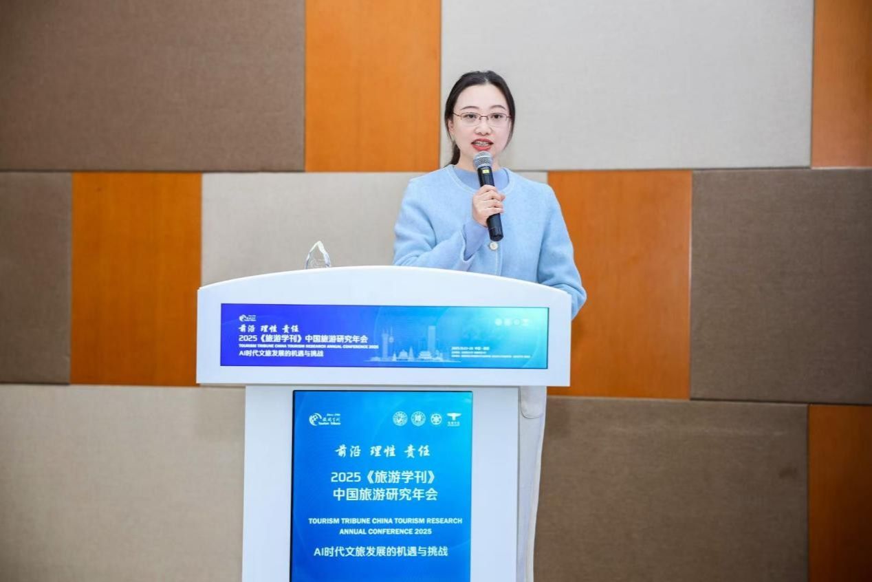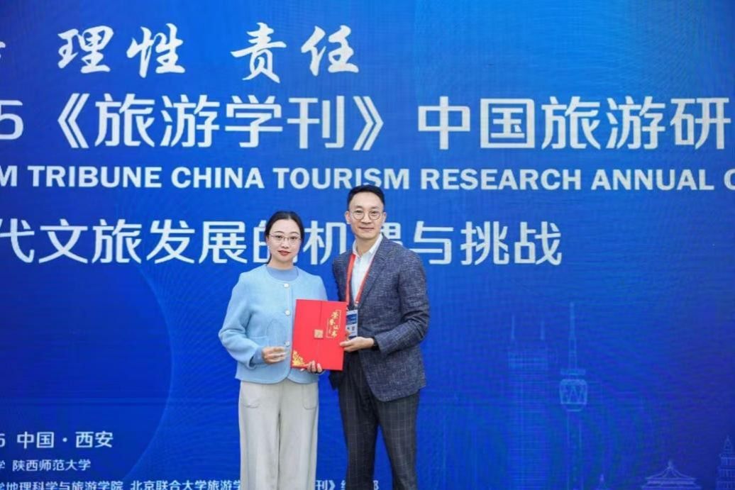 李想教授为获奖者蒋婷教授颁奖,他在颁奖词中说到,好的研究,不仅要有深度,更要有温度。《至味在人间:城市烟火气游客体验的探索性研究》强调,旅游的意义不止于壮丽的山河与名胜,更在于日常生活的温情。通过细致入微、发自内心的访谈,作者揭示了游客所追寻的,不仅是单纯的娱乐消遣,更有归属感、情感疗愈,甚至“家”的慰藉。研究构建的认知、情感和行为体验模型,生动地展现出日常生活如何成为旅行的灵魂。研究凸显出:旅游并非逃离现实,而是融入市井,与人间烟火同频共振,让游客成为生活的参与者。文章尤为契合疫情后人们对“共享生活”的渴望,展现了城市旅游作为慰藉与喜乐之源的独特意义。凭借其独创性、文化深度与真挚叙事,该文堪称“有温度的研究”典范。