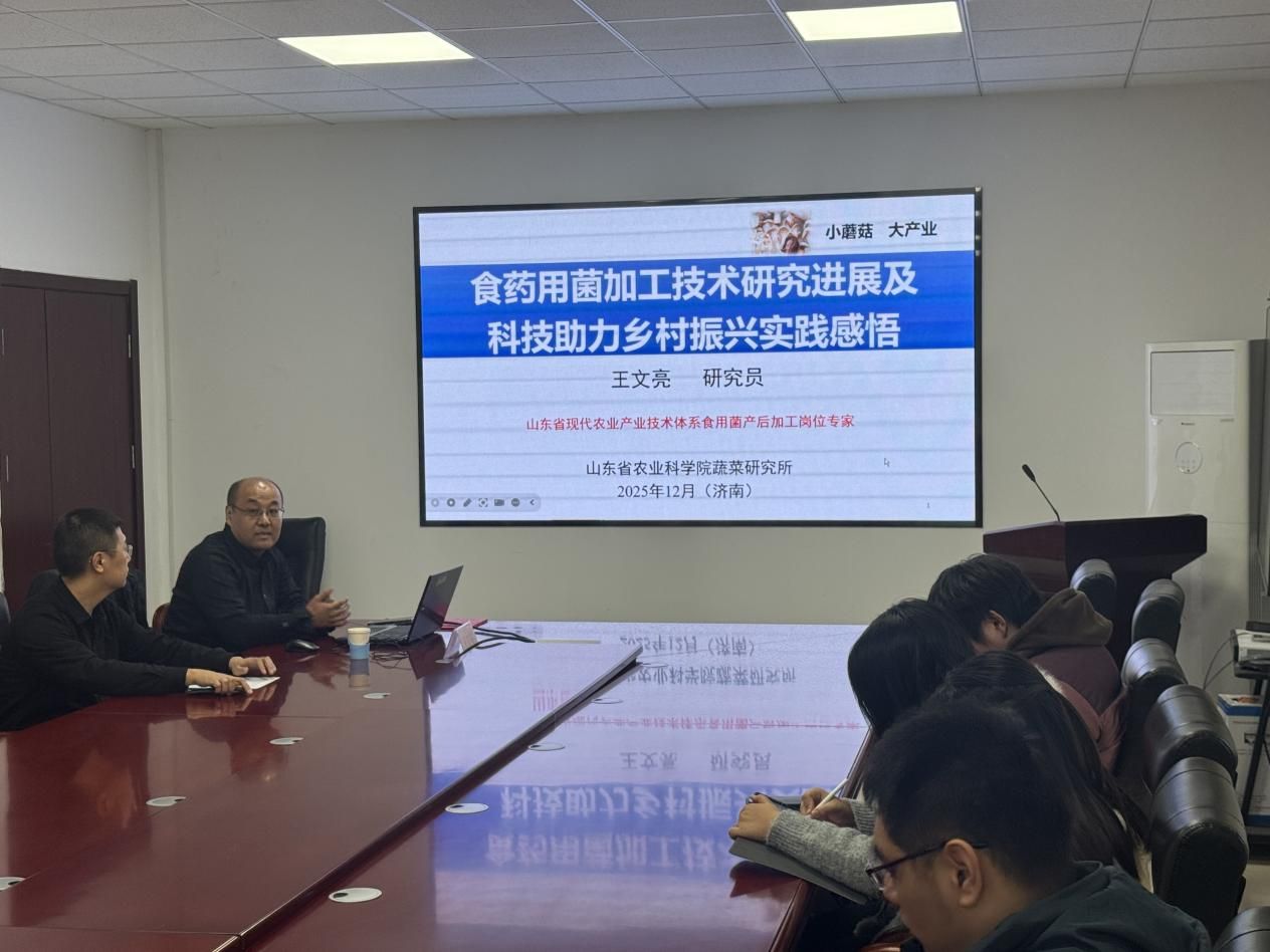 活动伊始,刘磊院长为王文亮研究员颁发了行业导师聘书。随后,王文亮以“食药用菌加工技术研究进展及科技助力乡村振兴实践感悟”为题作专题报告。他系统阐述了食药用菌的营养价值与产业现状,并重点剖析了保鲜加工环节的技术挑战,以杏鲍菇脆片等深加工产品为例,生动展示了科技提升农产品附加值的具体路径。