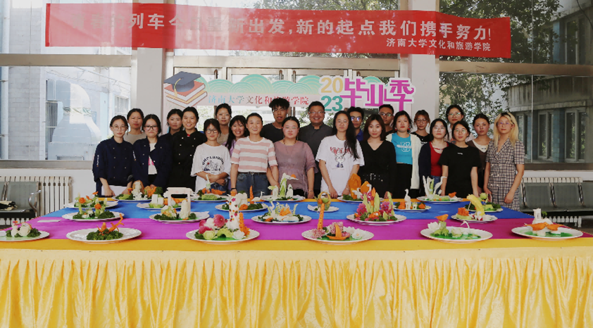 烹饪与营养教育专业大二学生于文旅楼大厅摆设食品雕刻展台,为2023届毕业生们送上最诚挚的祝福。各种寓有美意的食品展台齐聚一堂,供大家观赏。