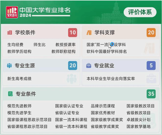 条件、学科支撑、专业生源、专业就业、专业条件 5个指标类别,共25项测量指标。