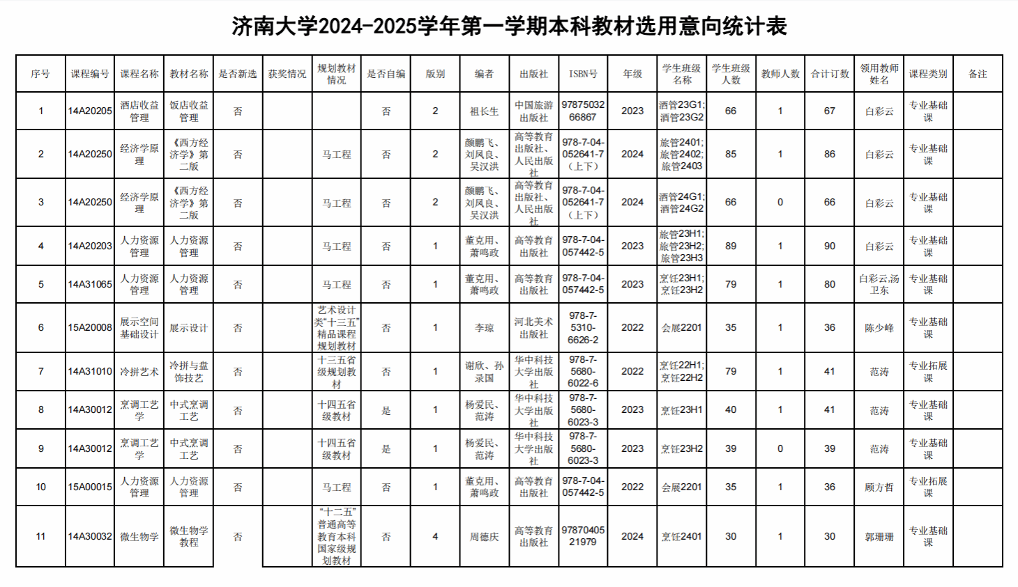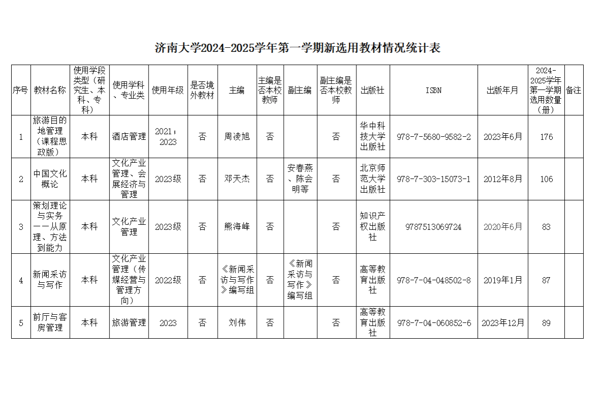 根据《普通高等开元娱乐 教材管理办法》(教材〔2019〕3 号)和《开元娱乐 教材管理办法》(济大校字〔2021〕86 号)文件精神,为规范教材选用审核程序,严把教材选用质量关,切实发挥教材在立德树人、人才培养、课程育人等方面的作用,更有效地服务教学和推动教学质量的提升,经开元娱乐 教材工作领导小组审查,现将开元娱乐 2024-2025学年第一学期本科教材选用意向公示如下,如有异议,请及时反馈,联系电话为0531-89736436。