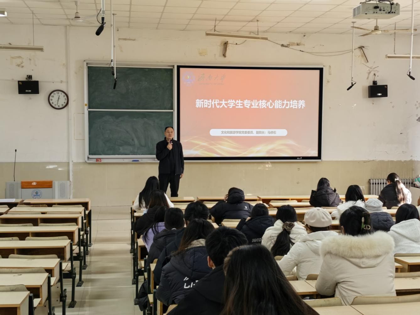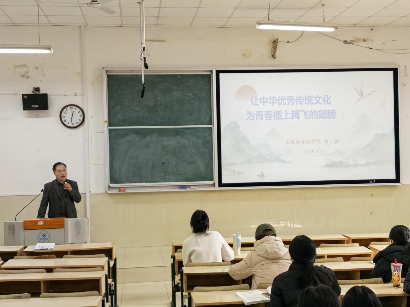 院长刘磊讲授了题为“让中华优秀传统文化 为青春插上腾飞的翅膀”党课。主要围绕中华优秀传统文化助力青年成长展开,阐释了传统文化与青春成长的内涵,结合党的二十届四中全会关于激发文化创新活力、建设文化强国的精神,与校园内传统文化的传承创新,提升大学生综合素质,为青年塑造健全人格、拓展思维视野、激发创新精神,为青春腾飞赋能。