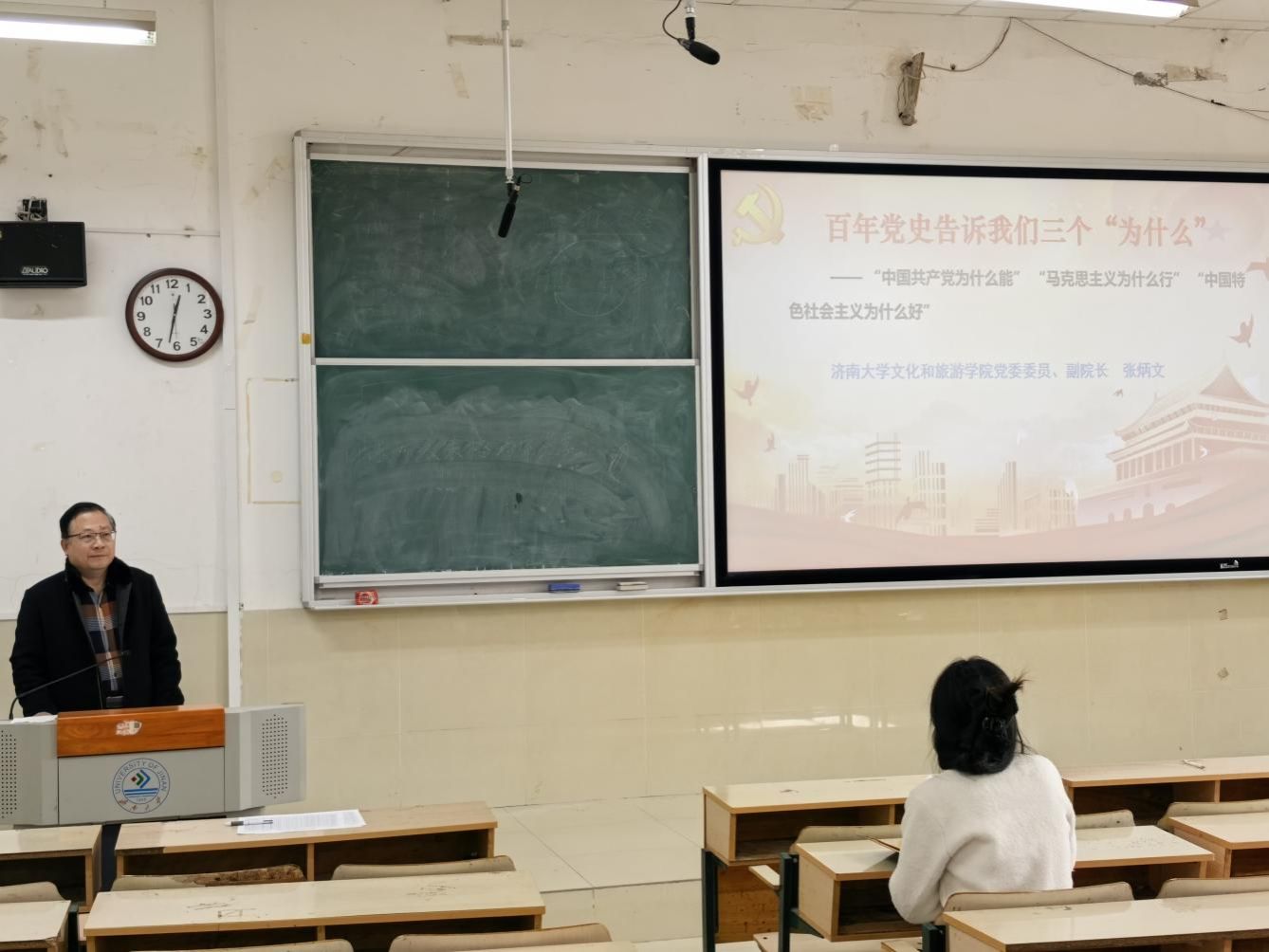 副院长张炳文回顾了中国共产党建党百年的艰辛历程,以百年党史告诉我们3个“为什么”——“中国共产党为什么能” “马克思主义为什么行”“中国特色社会主义为什么好”为题进行党史学习教育。深刻阐释三个“为什么”的核心原因,解答三个“为什么”的实践路径,同时对新时代大学生提出要求。要用科学理论武装头脑,以习近平新时代中国特色社会主义思想为坚定理想信念;以学习为动能,持续增长本领;践行党员先锋模范作用,为改革发展贡献力量。