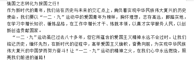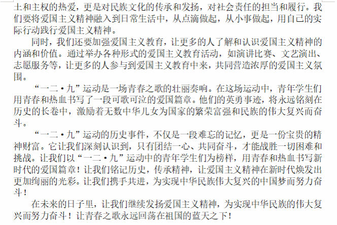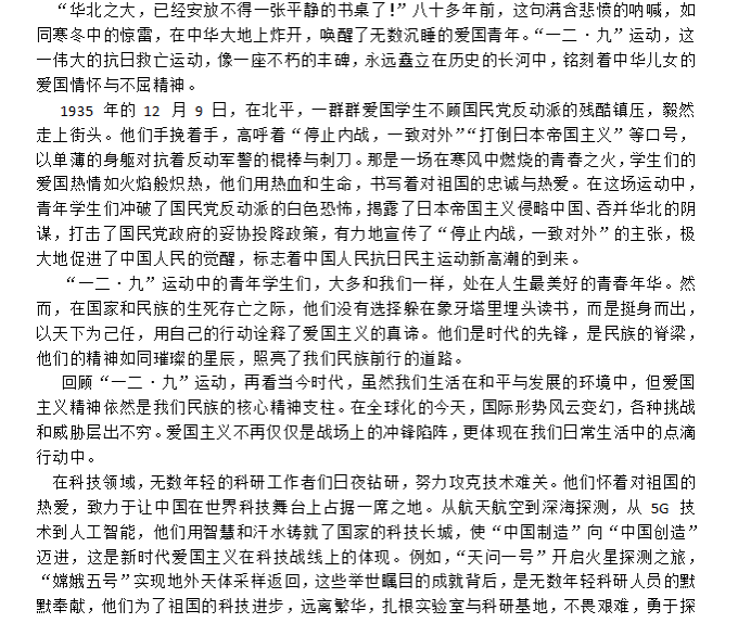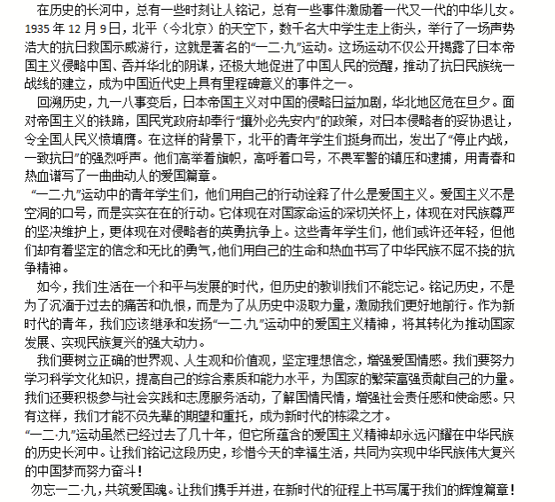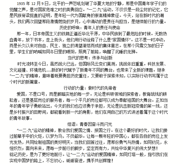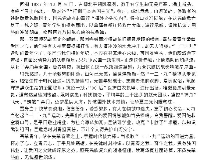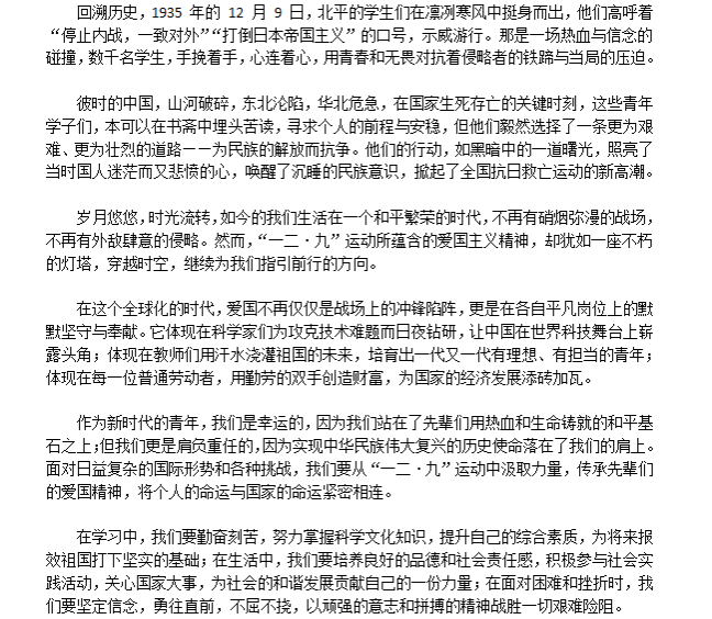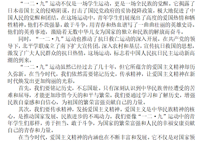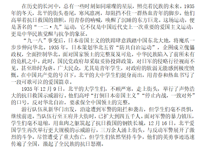 运动的历史事实及现实意义进行深度的学习与思考,运用自身独特理解和扎实文学功底创作优秀文章,纪念并传承“一二·九”精神,弘扬爱国主义,彰显当代青年的爱国热情。