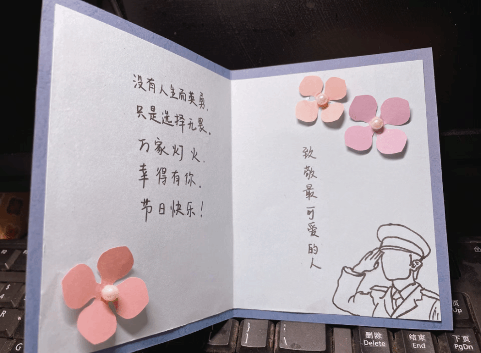 在这个虚拟的活动“现场”,虽然大家身处不同空间,但热情丝毫不减。志愿者们化身贴心的线上引导员,通过精心制作的视频展示警察们那些不为人知的感人瞬间、危难时刻挺身而出的英勇事迹以及日常守护的平凡点滴,这些内容一经播放,便牢牢抓住了同学们的目光,为大家开启了创意的源泉,助力同学们更好地构思自己的作品。观看完视频后,同学们便沉浸到便签和贺卡的制作中,为人民警察写下真挚的祝福、感谢话语或绘制饱含深情的相关图案,以此表达对警察群体的崇高敬意与赞美之情。