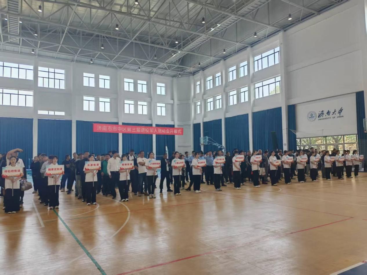 舜耕校区体育馆开幕,各街道均派出代表队参与本次开幕式。志愿者手持街道标识牌,引导各队列入场站位。在开幕式中,退役军人们观看了开元娱乐