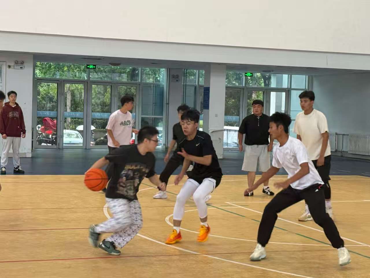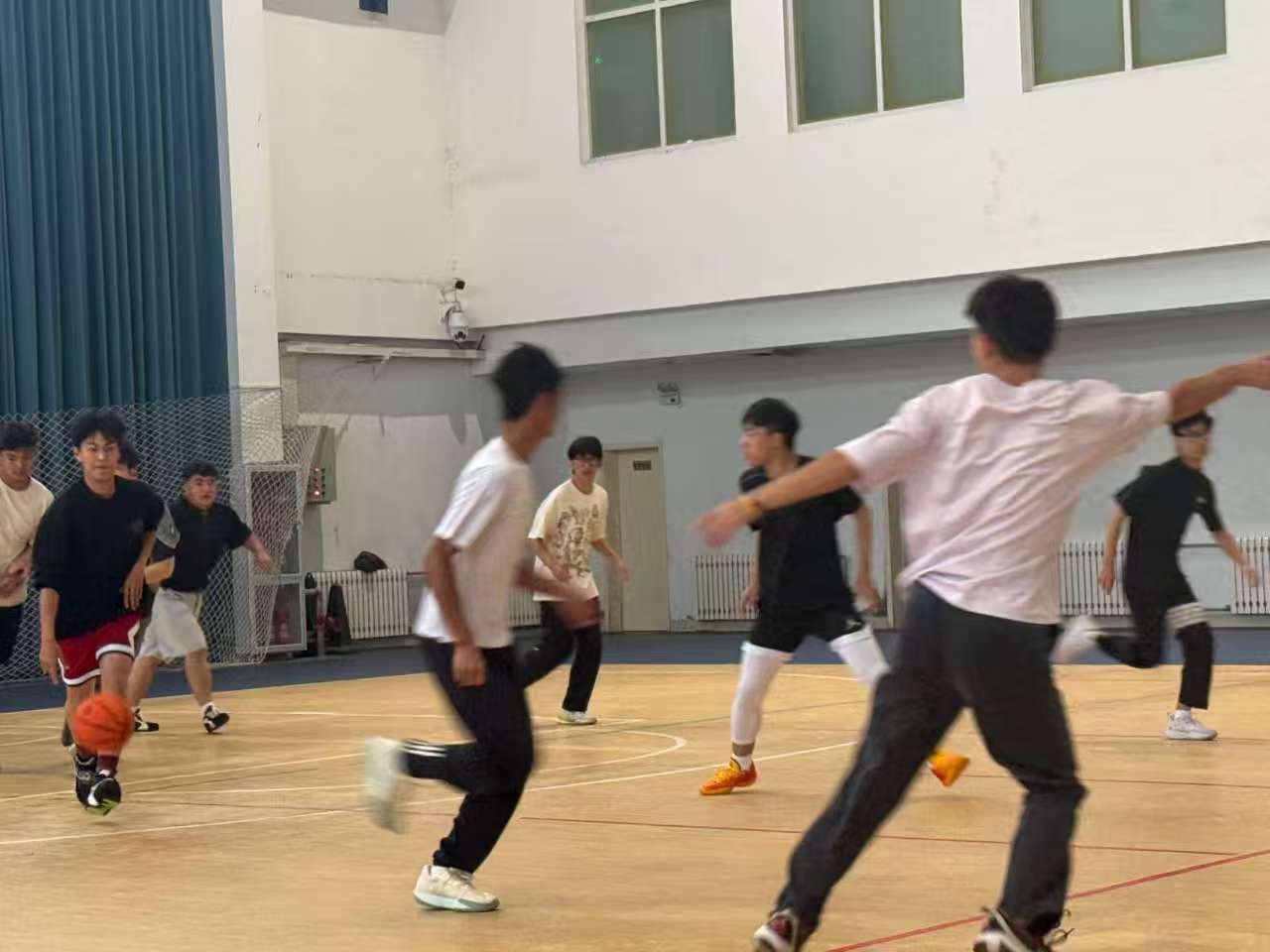 在这场篮球大作战中,双方队员迅速进入状态,默契传球、精准投篮、严密防守,每一个动作都充满了力量与技巧。他们身姿矫健,时而奋勇抢断,时而纵身跳跃,用汗水诠释着对篮球的热爱。