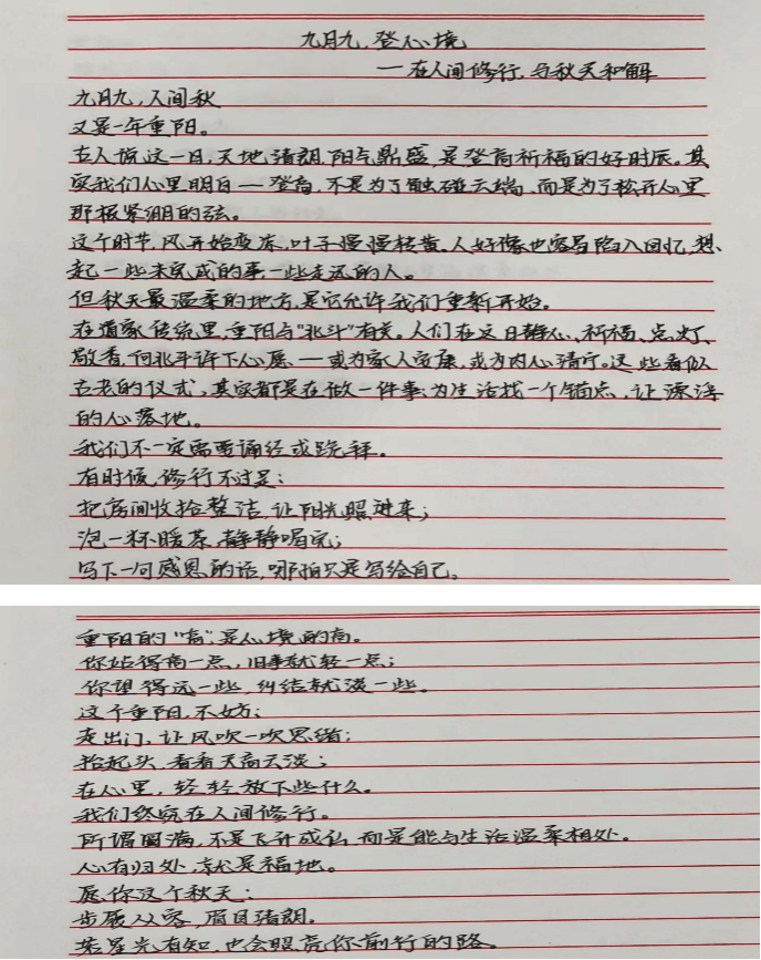 的学科特色,将心理健康教育、情感表达训练与传统文化传承有机融合。学生可围绕“重阳·敬老·感恩·传承”主题,自主选择创作形式:书写现代诗文抒发对传统节日的感悟;撰写“一封家书”向长辈表达真挚情感;或结合长辈的口头禅设计专属表情包、贴纸,以轻松幽默的方式传递关爱。