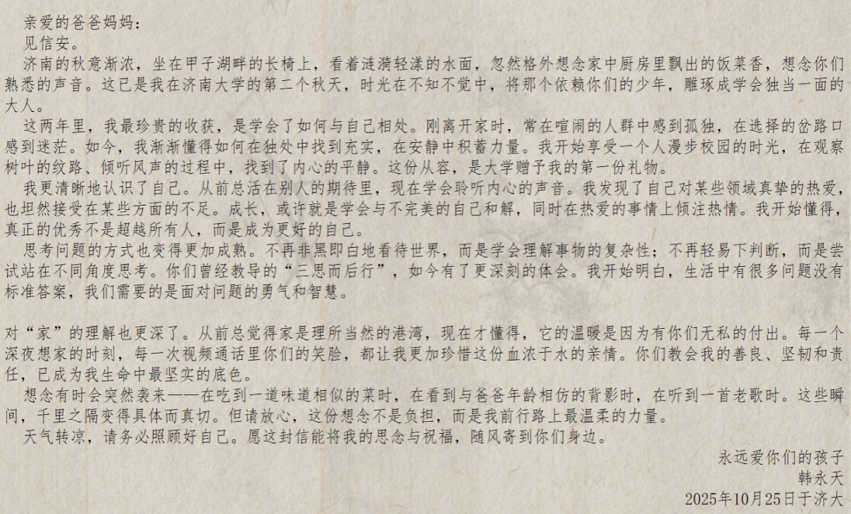 心理服务协会于2025年10月24日至10月31日面向全院学生成功开展了“九九话重阳,青春绘新意”重阳专属语线上征集活动。活动以重阳节文化内涵为核心,鼓励学生通过现代诗文、家书、创意表情包等形式,向长辈表达感恩之情,传递青春视角下的传统文化新意,受到同学们的广泛关注和积极参与。