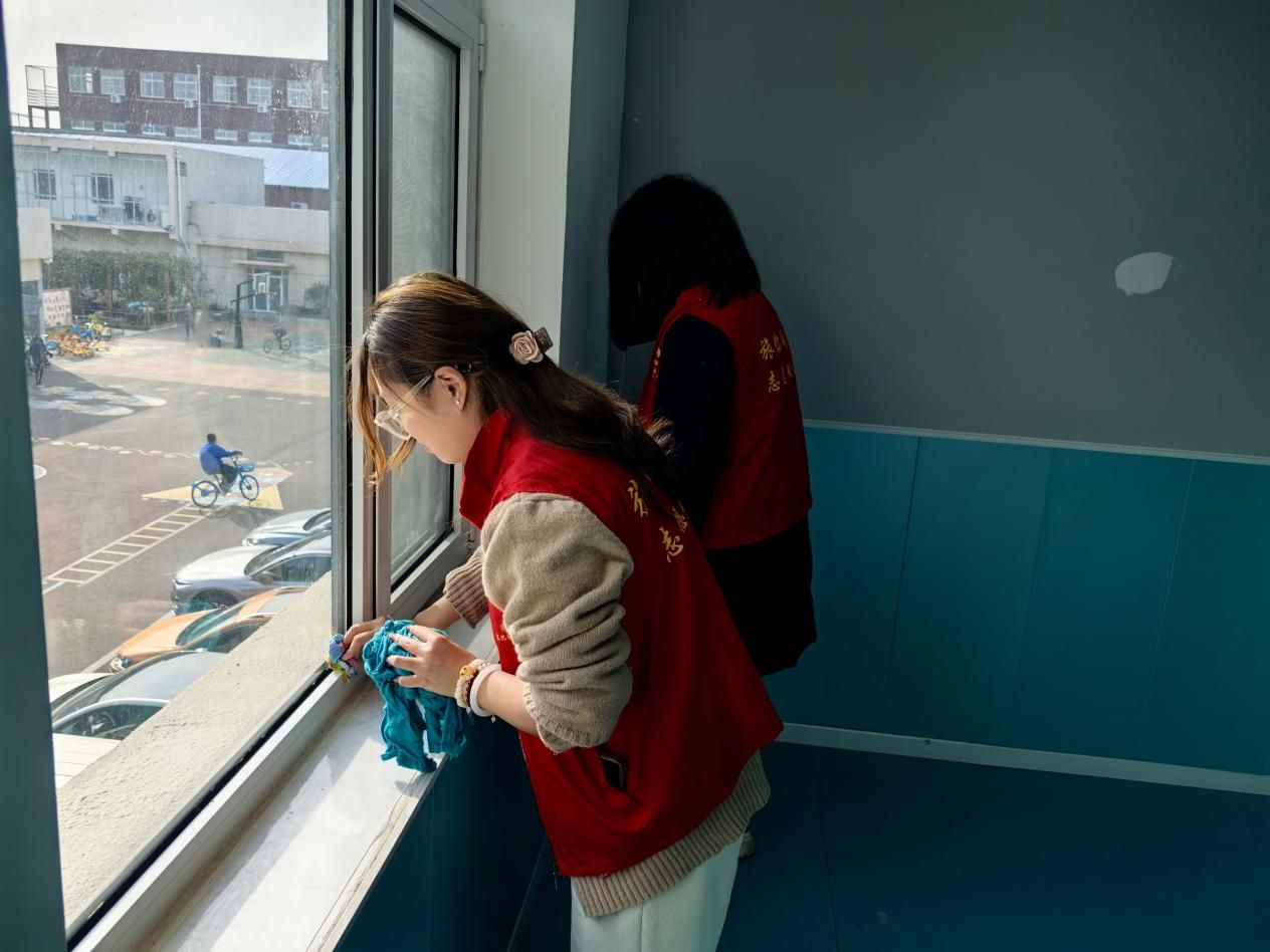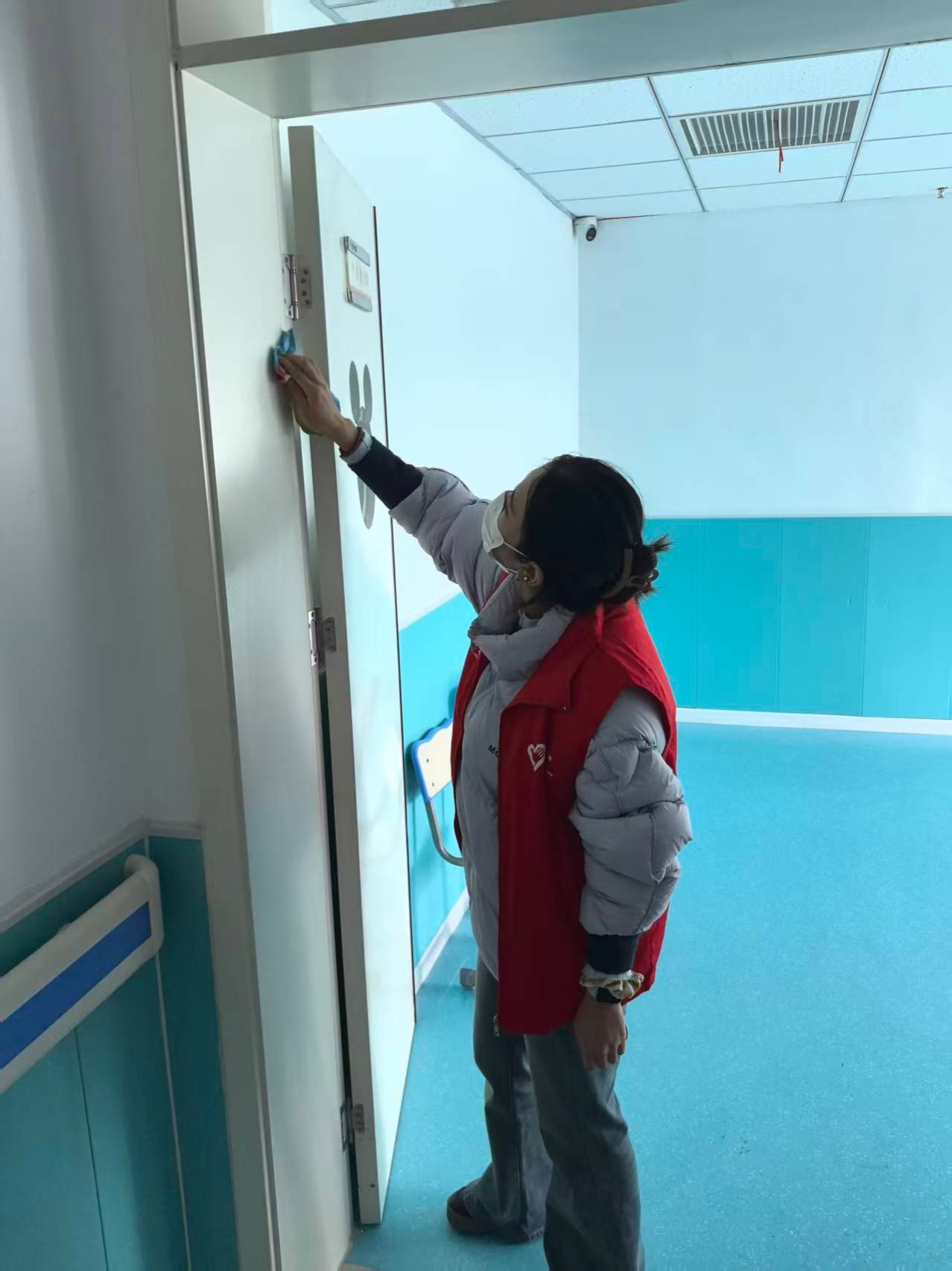 公共设施的清洁聚焦高频接触部位,志愿者们手持消毒湿巾,逐一擦拭活动室门把手、窗台、储物柜拉手及玩具架边缘。面对频繁触碰的门把手,反复擦拭确保消毒彻底;遇上窗台上的顽固污渍,便用温水浸湿抹布耐心清理,让每一处设施都洁净光亮,为孩子们筑牢健康防线。
