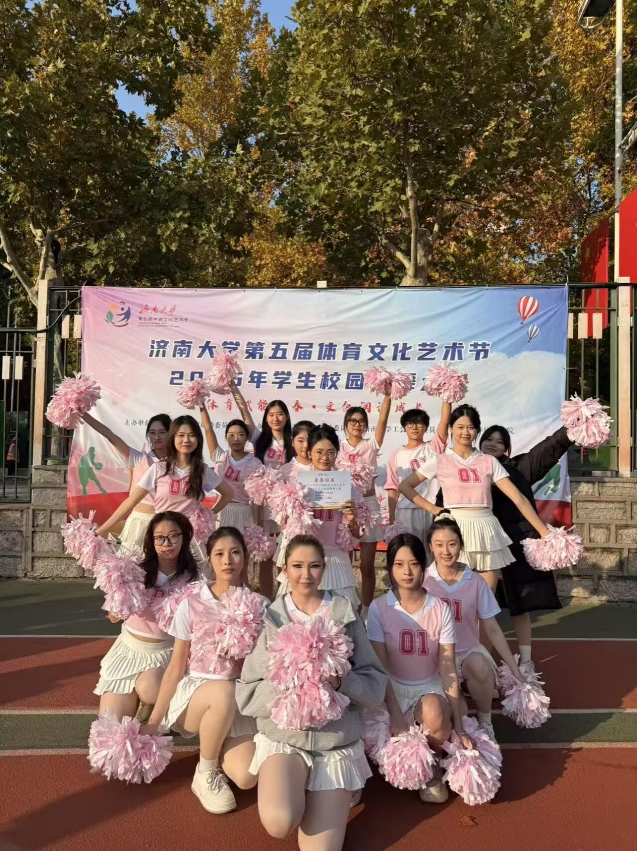 代表队以饱满的精神面貌登场。伴随着《Ice Cream》轻快的旋律,队员们先按规程完成前奏后“面向裁判的固定方向舞步段落”,随后通过五次以上的队形变化展现编排巧思——从整齐的方阵到灵动的分组造型,再到结尾的集体创意动作,每一个环节都紧扣赛事要求,每一次伸展、旋转与跳跃都恰到好处,每一次转身都满含热情与自信,将文旅专业的审美特色融入其中。队员们身着统一服装,动作整齐有力,配合默契,用身姿诠释青春的奔放,用热情书写青春的浪漫。整套表演既展现了对赛事规则的精准把控,又传递出青春活力,赢得现场裁判与观众的一致认可,最终以高分斩获一等奖。