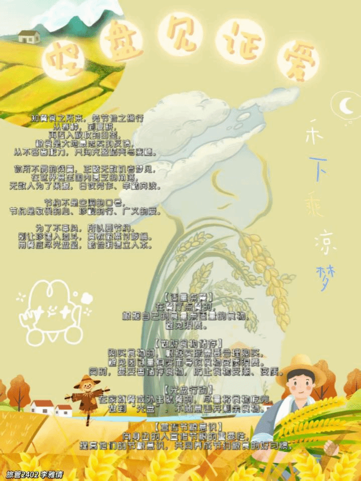 作为校园文化建设的鲜活实践,活动既为学生搭建了创意表达的舞台,更以群体参与的方式凝聚了价值共识:当“节约为荣”成为校园里的青春共鸣,勤俭理念便自然融入了校园文化的生态中,让充满温度的正向氛围成为校园里的一抹亮色。青年是风尚的引领者,校园是文明的孵化器。这场节粮活动的价值,不止于一周的校园实践:从食堂的“光盘”到生活的“节用”,从学生个体到家庭、社会,青春的行动正成为撬动节约风气的微小支点,让“浪费可耻、节约为荣”的理念,在更广阔的生活空间里生长蔓延。