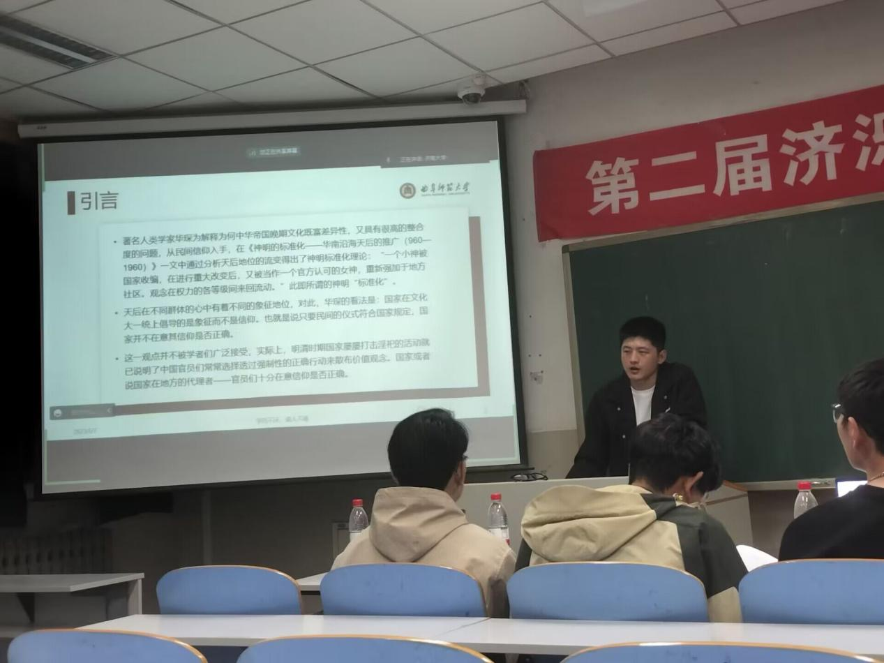 此次活动由常睿、焦睿韬、王子懿、魏宜春、张阴松、常景剀六位同学依次讲解《明史》中的孔府研究、《清中期尼山的传统法秩序》、《难游路》初探、评《中国转向内在》(读书报告)、《出路何在:代天巡狩背后的五帝信仰正统化》、《圣裔里外:对元至清代曲阜东野氏家族世系考察》,在讲解过程中各位同学充分结合自己观点,分享自己独特的学术见解;同时现场与线上同学积极参与讨论,共同营造了良好的学术氛围,在历史的学习和研讨上实现了交流见闻、互相学习的目的。