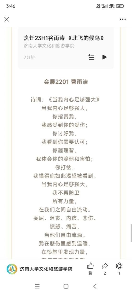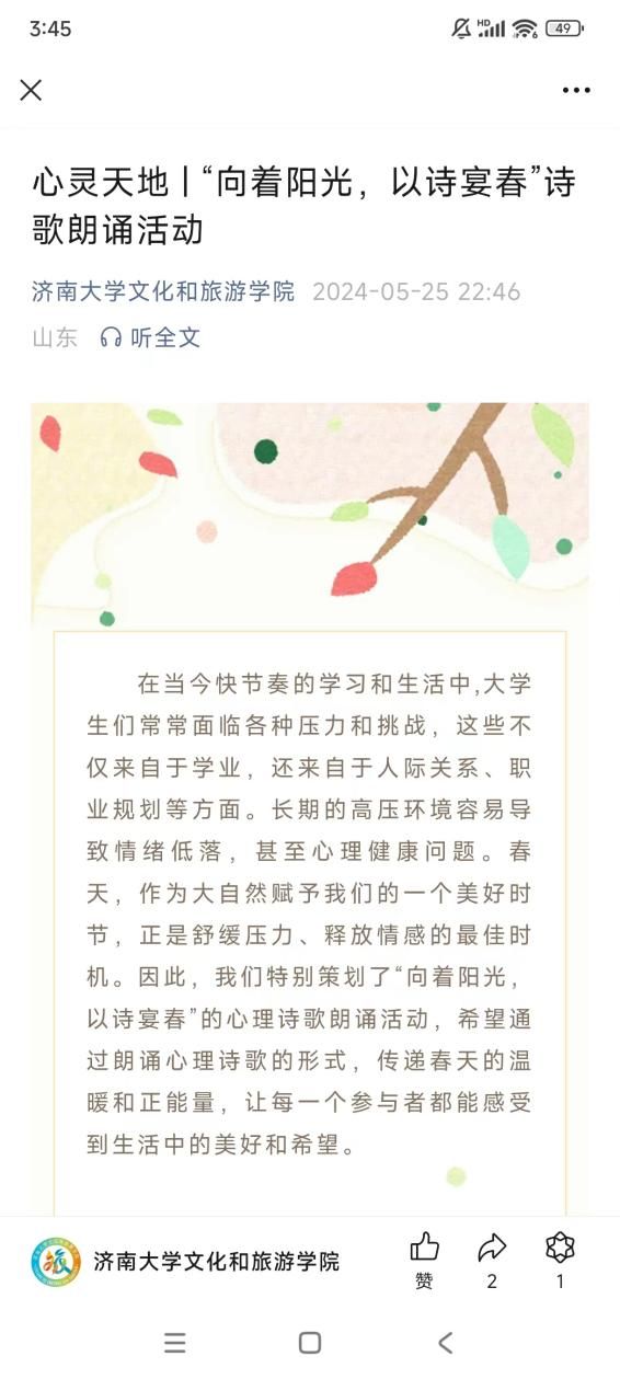 通过“向着阳光,以诗宴春”心理美文诗歌朗诵活动,让学生感其声,领其情,抒其志,营造了浓厚诵读抒情解郁氛围,增强了大学生的责任感和使命感,提醒大学生珍惜青年时光养成健康良好的人生观、价值观、世界观。活动共收到来自学生的30余份参赛作品,通过公众号推送形式,传递春天的温暖和力量,让每一位朗读者和聆听者都能感受到生活中的美好和希望。