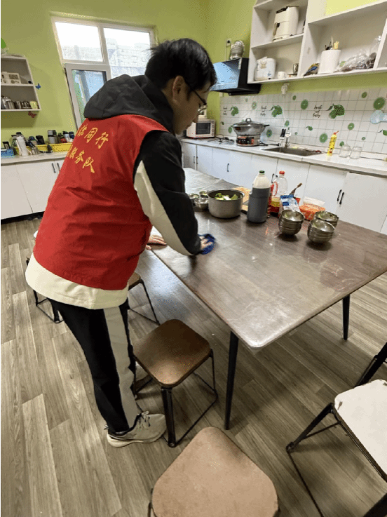 为给孩子们打造一方洁净舒适的成长天地,志愿者们又化身“暖心守护者”,走进厨房与公共区域,开启一场细致的“焕新行动”。他们手持抹布,细细擦拭餐桌的每一寸肌理,让油污与痕迹悄然褪去;俯身清扫,认真清理地面的每一粒尘埃,让洁净与清爽铺满角落;弯腰捡拾,仔细清除藏匿的杂物,让温暖与安心环绕左右。汗水浸湿了衣衫,却挡不住他们眼中的坚定;疲惫萦绕在心头,却抵不过心中的暖意。“能为孩子们营造干净的环境,守护他们的健康成长,再累也甘之如饴。”志愿者杨羽豪的话语朴实无华,却用双手为孩子们筑起了一道坚实的“安心防线”,让这方小小的天地,成为孩子们肆意生长的温暖港湾。