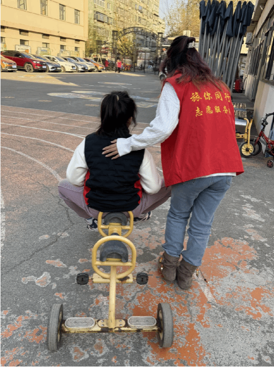 室外活动场上,暖阳倾泻,时光温柔。志愿者们卸下拘谨,化身孩子们眼中最亲切的“爱心伙伴”,用笑容消融距离,用陪伴温暖时光。他们或俯身调试康复设施,牵着孩子的小手慢慢探索,引导他们在嬉戏中舒展肢体,感受运动的快乐;或与孩子面对面相视,静静倾听他们稚嫩的呢喃,用温柔的眼神回应每一份纯真,用温暖的话语抚慰每一颗心灵。清脆的笑声似春日的风铃,在空气中轻轻回荡;温柔的叮嘱如冬日的暖阳,浸润着每一个角落。阳光、笑脸、欢声、细语,交织成一曲最动人的童年乐章,让爱的暖流,在彼此心间静静流淌,让纯真的童心,在陪伴中自在绽放。